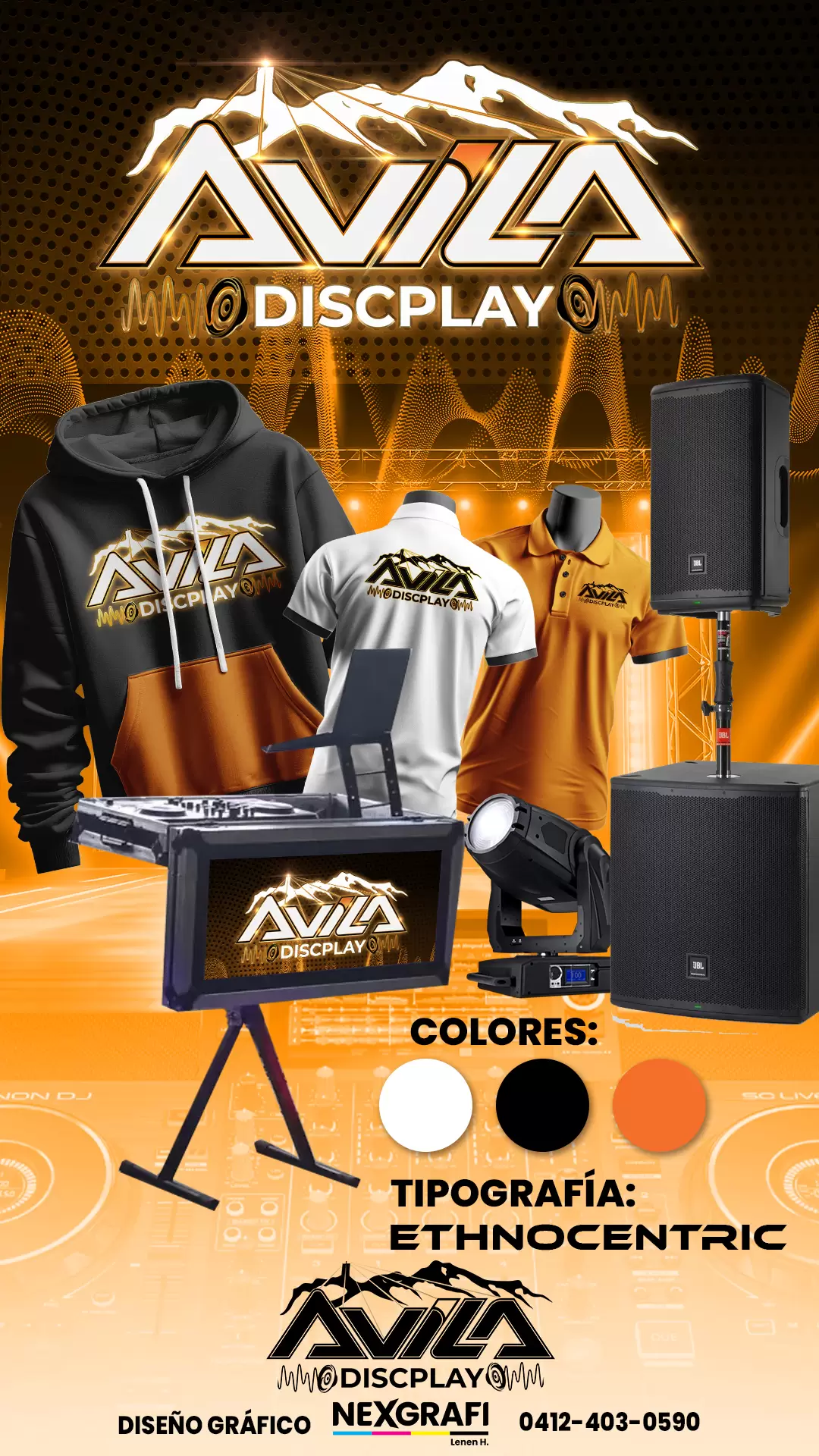 Este logotipo para «Avila Discplay», la cual es una empresa de sonido e iluminación en Caracas, combina elementos gráficos y tipográficos para evocar una sensación de potencia, movimiento y conexión con el paisaje local de la gran Caracas.